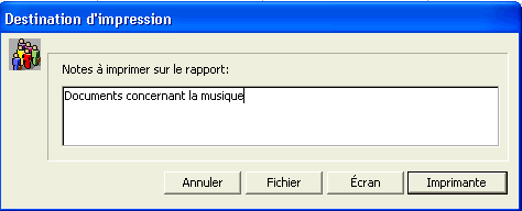 L'illustration ci-dessus montre qu'il est possible d'ajouter une note qui sera inscrite sur le rapport, de choisir une prévisualisaton à l'écran de votre rapport ou une impression sur fichier. Ce dernier choix permettra d'exporter les données des documents sélectionnées en utilisant le rapport d'impression comme filtre d'exportation. Seuls les champs d'informations contenus dans le rapport seront exportés.