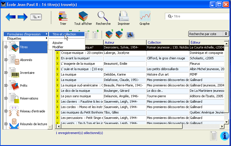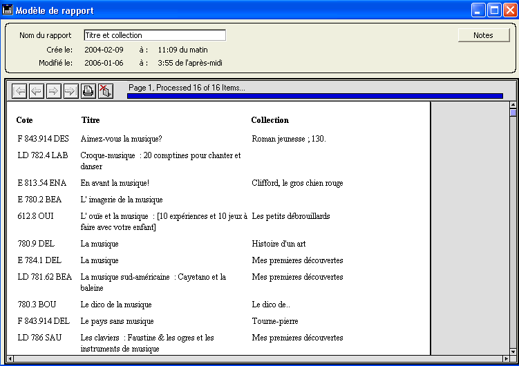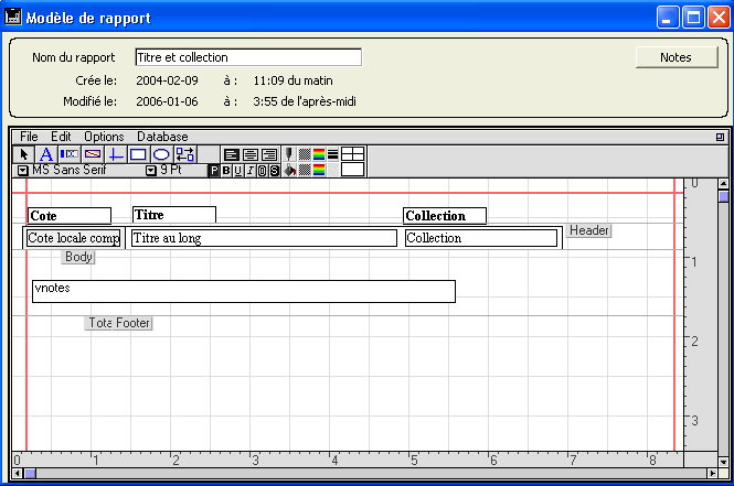 Nous avons ci-dessus un exemple de formulaire d'impression. Celui-ci imprimerait la cote, le titre ainsi que la collection. On peut ainsi placer n'importe lesquels des champs de la base de données dans ces rapports.