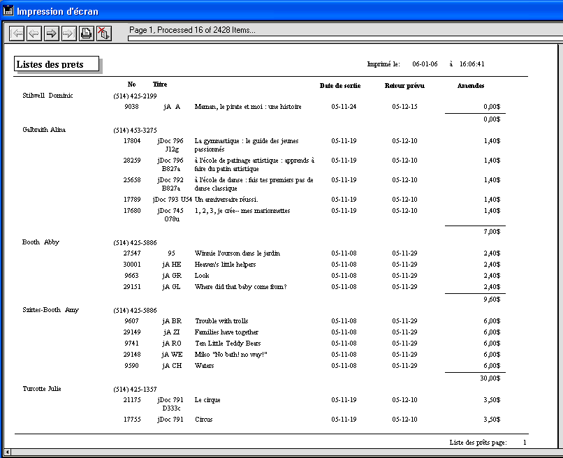 L'illustration ci-dessous montre comment avec cet éditeur de rapports, nous pouvons réaliser des rapports beaucoup plus complexes. Nous avons ici un rapport permettant d'imprimer le dossier des abonnés en affichant un sous total des amendes à payer