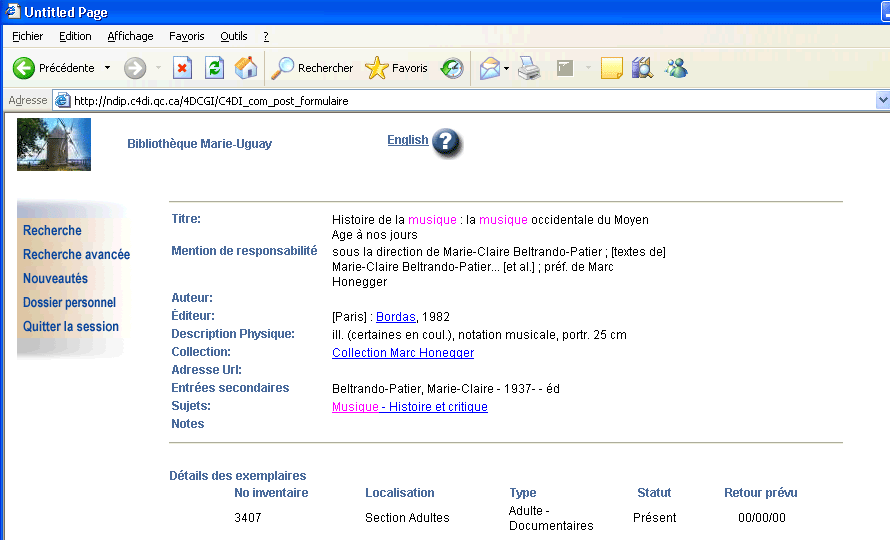 Cet écran affiche un exemple de détail d'un document. Cet affichage peut être différent selon le type de support. En effet, un CD ROM pourrait utiliser un formulaire d'affichage légèrement différent que pour une monographie. Ces réglages se font à partir des pages d'administration du logiciel.