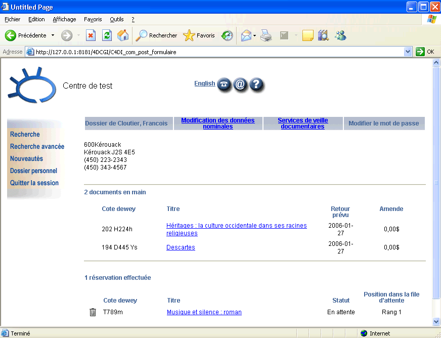 En s'identifiant avec un login et un mot de passe, il est possible de visualiser le dossier d'un emprunteur. Celui-ci pourrait même modifier ses données nominales.